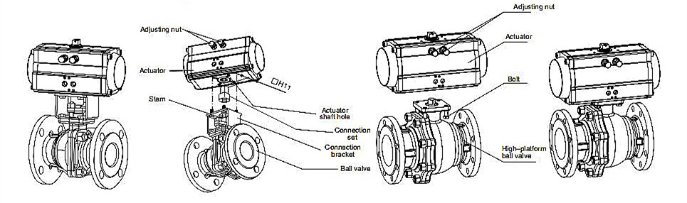 โดยทั่วไป การประกอบแอคชูเอเตอร์และบอลวาล์วจะดำเนินการโดยใช้ฉากยึดและชุดการเชื่อมต่อ หรือสามารถประกอบได้โดยการใส่ก้านพิเศษเข้าไปในรูเพลาของตัวกระตุ้นนิวแมติกส์ ตรวจสอบให้แน่ใจว่าจมูกสปินเดิลไม่ยื่นออกไปนอกรูเพลาของแอคชูเอเตอร์ เนื่องจากอาจทำให้เกิดการทำงานผิดปกติเนื่องจากการติดขัด ชิ้นส่วนที่เชื่อมต่อทั้งหมดจะต้องมีความแม่นยำในการประกอบสูง มิฉะนั้นการเปลี่ยนแปลงมุมเปิดหรือปิดอาจทำให้วาล์วรั่ว ความทนทานต่อการประกอบชิ้นส่วนควรเป็นไปตามมาตรฐานที่เกี่ยวข้อง ความคลาดเคลื่อนของปลายสปินเดิลของรูเพลา (ก้าน) รูสี่เหลี่ยม และช่องคือ H11/d11 โดยมีความขนานและความสมมาตรที่พิกัดความเผื่อทางเรขาคณิตเกรด 9