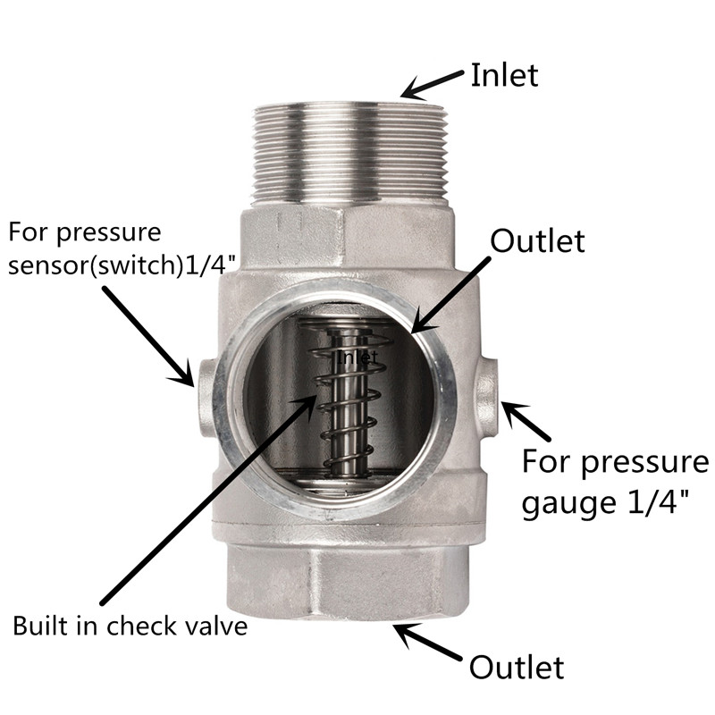 คุณสมบัติหลักของตัวเชื่อมต่อห้าทางสเตนเลสสตีลที่ไม่มีเช็ควาล์วที่ผลิตโดยโรงงาน Joepai คือตัววาล์วนั้นมีห้าพอร์ต: 1" ตัวเมีย x 1" ตัวเมีย x 1" ตัวผู้ x 1/4" ตัวเมีย x 1/4" ตัวผู้ มันเป็นส่วนประกอบที่เชื่อมต่ออย่างหมดจดด้วยช่องกลวงภายในและไม่มีชิ้นส่วนที่เคลื่อนไหวและไม่มีฟังก์ชั่นการควบคุมใด ๆ เช่นเช็ควาล์วหรือข้อบังคับ จุดประสงค์เพียงอย่างเดียวคือการรวบรวมหรือกระจายของเหลว สำหรับชุดควบคุมระบบปั๊มขนาดเล็ก ตัวเชื่อมต่อห้าทางทำหน้าที่เป็น แพลตฟอร์มการติดตั้งในตัวขนาดกะทัดรัด รวบรวมส่วนประกอบการตรวจสอบและการป้องกันที่สำคัญทั้งหมดไว้ด้วยกัน
